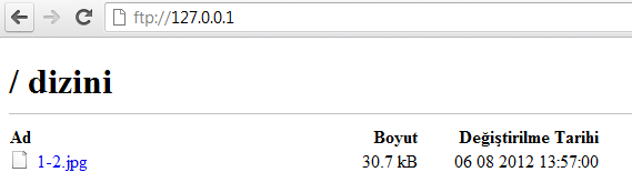 ftp://127.0.0.1 adresine gidip kullanıcı bilgilerini girdiğimizde aşağıdaki gibi bir ekran bizi karşılayacaktır.